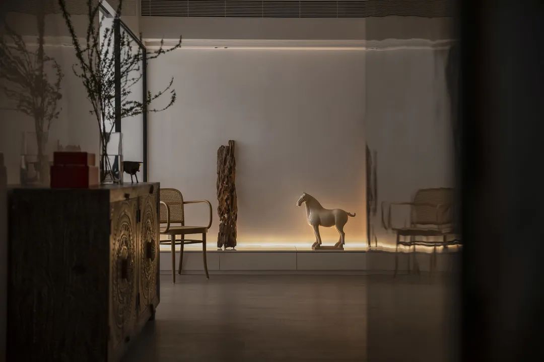 ▲电视墙区域定制地台+暗藏灯带设计,布置一幅大尺寸的抽象艺术画,还有骏马造型的摆饰品,也让空间显得更有独特高级的艺术气质。