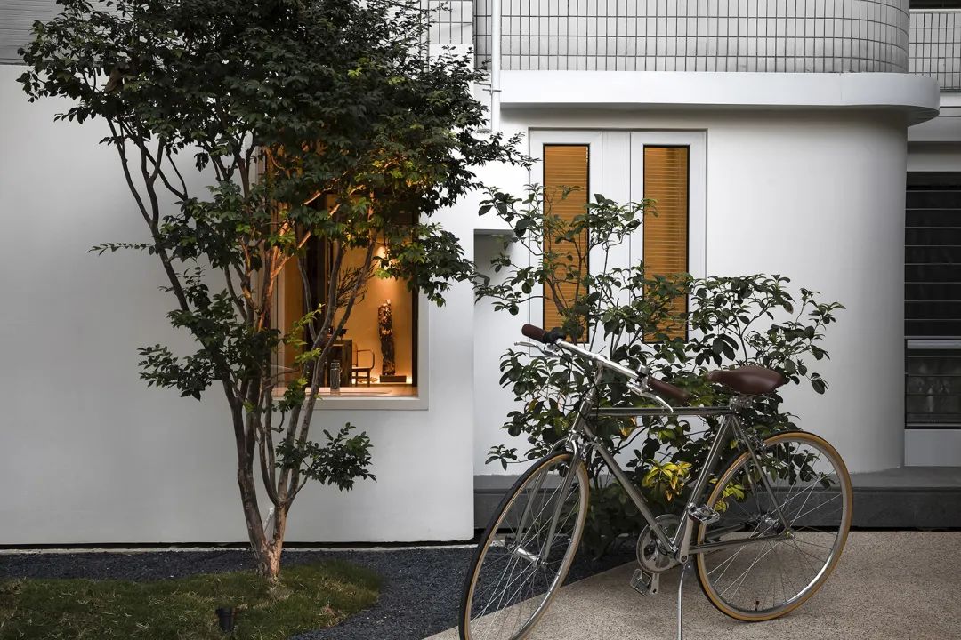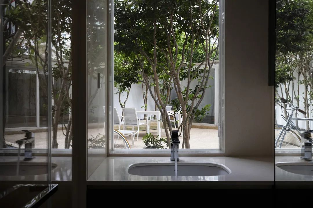 ▲室外独立的小庭院,种上小树与草坪,与极简的建筑外观相呼应,显得格外的清新禅意有生机感。